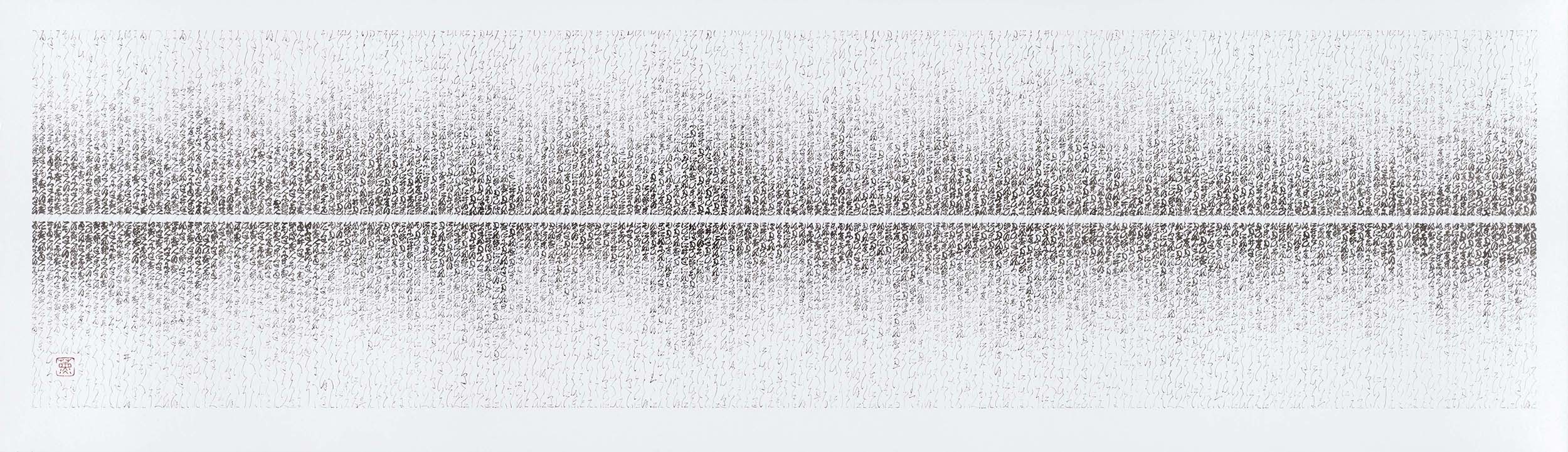 Moonlight shines across the boundaries of time and place, inspiring artists, musicians, novelists, and many others. The text in this work is the musical score of "Moonlight Sonata" by Ludwig van Beethoven interpreted into Japanese syllables. It is often thought that music has no borders, however, musical score is “Do-re-mi” in Italian, “C-D-E” in German and “Ha-ni-ho” in Japanese. Even music itself is not free from cultural borders. What I insisted on was to cross the borders between traditional and modern, Western culture and Eastern, music and calligraphy. Through my globe-trotting background, "Crossing Borders" has become one of the core ideas of my work. My aim is to embody purity, transience, and holiness of a full moon by crossing the borders and merging them together. I sought to reach the night sky that attracted people, past and present. After several miscarriages and empty time without creating any work, I retreated to my room and devoted myself to my work day and night. Writing to meditate and writing to embrace myself. Writing has a soothing effect, as can be seen from the fact that the act of writing is adopted into various religions around the world, however, there is no better tool than the Japanese traditional kana characters to create such a work filled with suffering. Kana characters were in particular the characters that Japanese aristocratic women had used since the Middle Ages to vent their feelings and express themselves. Creating my artworks using kana characters has filled my empty heart. Unfortunately, kana characters were abandoned and forgotten in Japan due to its complexity and the difficulty in passing down and acquiring the necessary skills. The Japanese government made a decision in 1900 to exclude these characters from school education. As Charles Chaplin has presciently described in his film, anything inefficient was banned in “Modern Times”. In my creation, I use only one type of brush and inkstone. Similar to the Western pointillism artist who create images by the contrast of dots, my works are created by the contrast of characters, which I produce through the pressure I give to my brush. This unique art style is possible since I use my technique as a master of Japanese traditional calligraphy. I must say, creating images through fluid and finely written characters is very time-consuming, however, I am proud to be inefficient. I believe that the massive time I spent writing to cure myself penetrates through my artworks and is capable of curing whoever who stands before my artworks and spends time to gaze them. Copyright © 2010-2025 Kaoru Akagawa All Rights Reserved. |